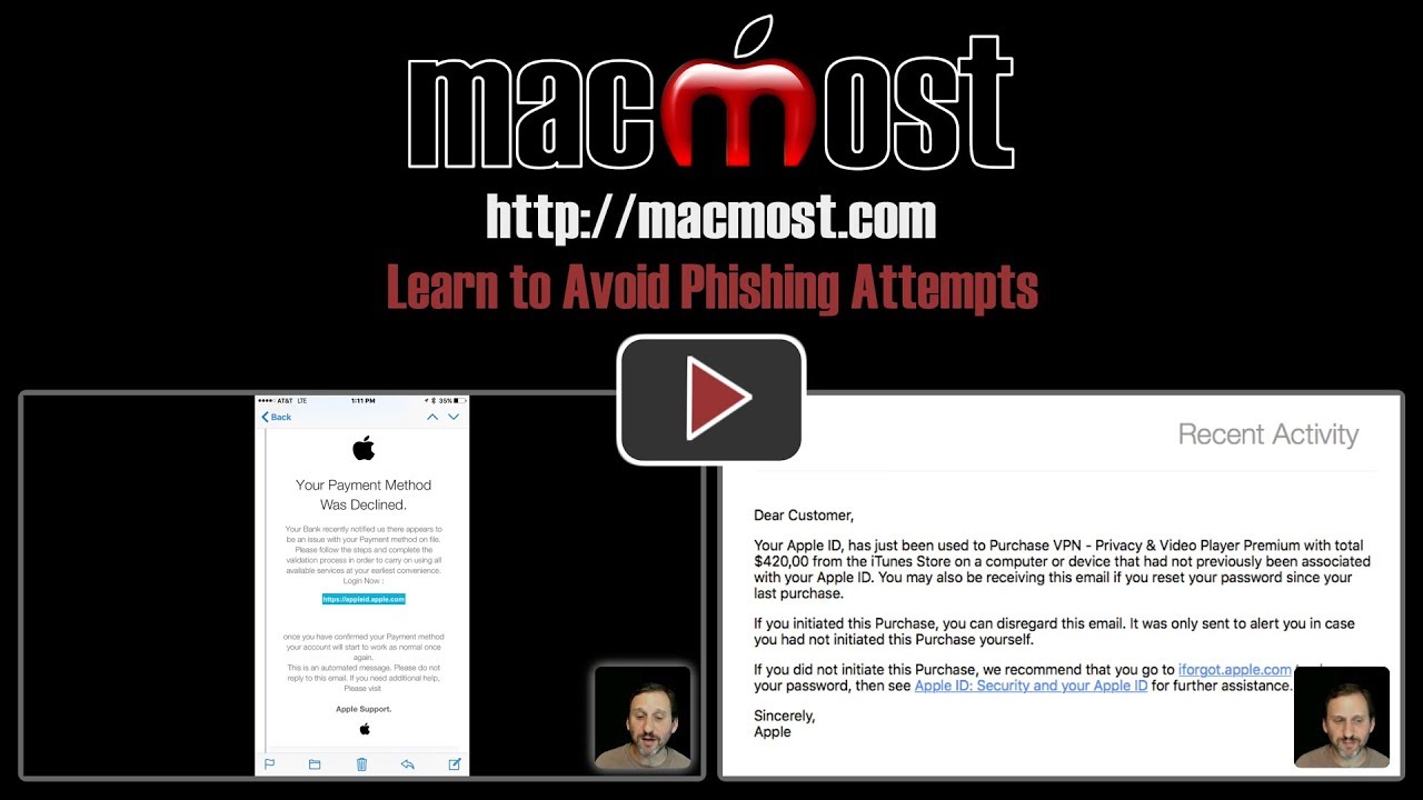 Let's talk about Phishing. I recently asked MacMost users to send me examples of phishing attacks that appear to come from Apple. This is a particular problem for Apple users. Phishing attacks can come from anywhere. They can come from your bank, they can come from Amazon or eBay. But for Apple users we get a lot of them that appear to come from Apple. They target us because we have iCloud accounts or maybe they just target everybody and you just happen to be somebody who has a Mac and got one of these.
