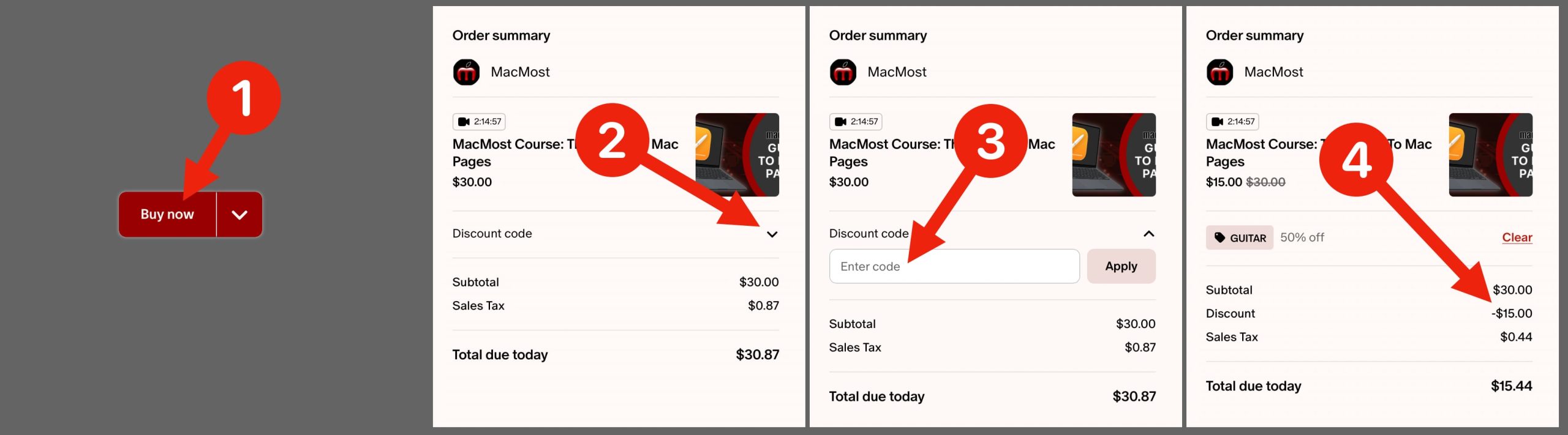 A: Click the Buy Now button. The next page shows your cart. Click the reveal button next to the Discount code label. Then enter the code into the field and click Apply. Then check carefully to make sure the code is applied and the new total reflects the change.