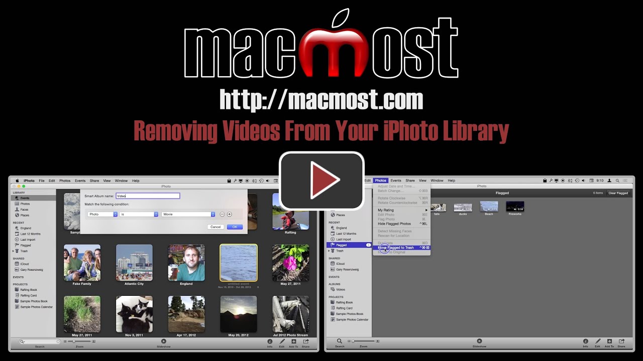 If your iPhoto library is huge, one way you can cut it down is to remove all of the videos and store them elsewhere. But finding and then deleting videos in iPhoto can be tricky. You'll need to create a smart album, and then flag the videos before using a hidden command that moves all flagged items to the trash.
