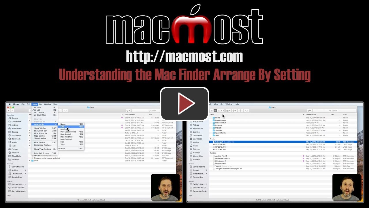 So let's take a look at the Arrange tool. It has been around for years but a lot of Mac users still don't understand exactly what it does and how it's different than sorting. To best look at it let's switch from Icon view here in the Finder to List view. So we see the list of all the files and folders and things in this folder called Docs. Now if we want to sort these then one way to do it is to click on the column heading. So here I've got Name and Date Modified and Size. So if I wanted to sort them, say, by size I can click on it and it will sort them by size. You can see the little arrow here that indicates the direction of the sort. I can click it again and it sorts in the opposite direction. The same with Date Modified. To get it back to alphabetical order I can sort by Name and go in either direction.